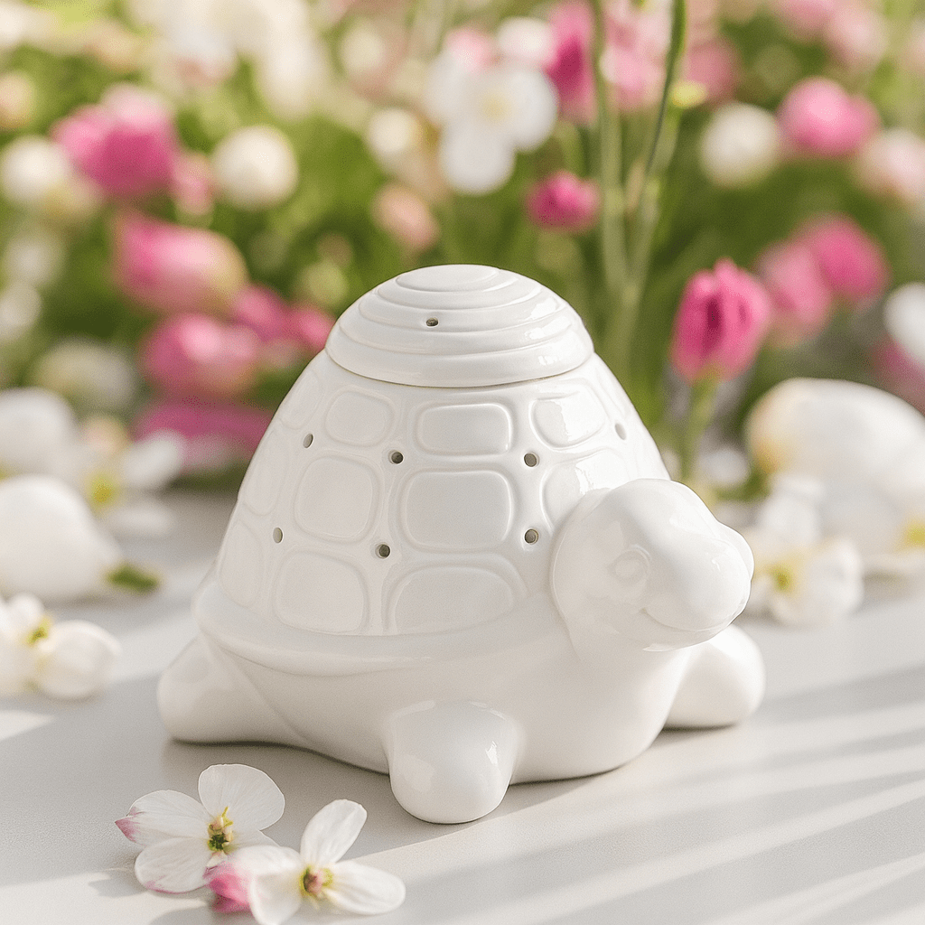 Brûle-parfum tortue. Entièrement blanche, le sommet de sa carapace se soulève pour accueillir vos cires parfumées.